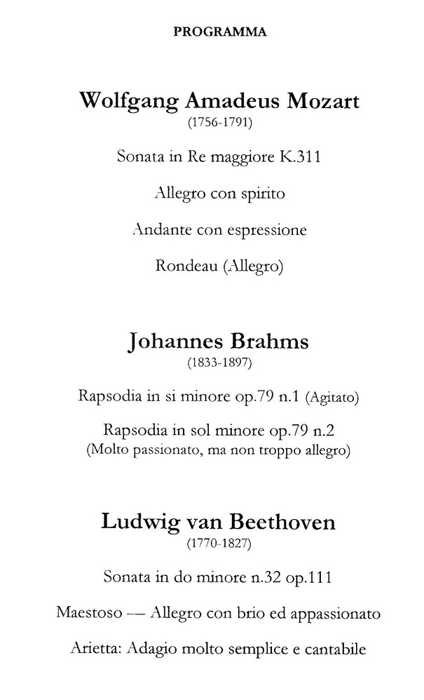 Musiche di Beethoven, Shubert, Liszt, Debussy, Bach, Busoni