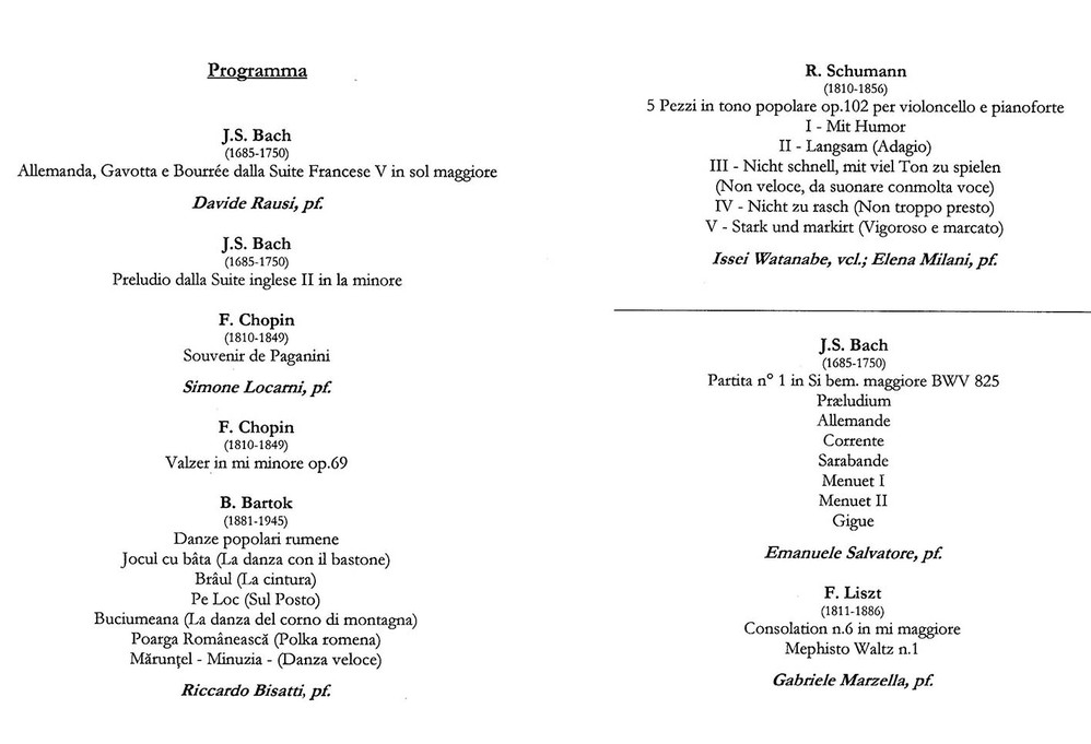 Musiche di Bach, Debussy, Bartok, Schumann, Prokofiev